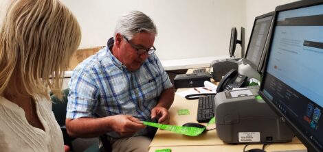 Times Observer photo by Brian Ferry Warren County Treasurer Denny Munksgard prints out hunting license tags Monday morning for customer Vera McCullough. The licensing system and the printing system for the tags were problematic Monday.