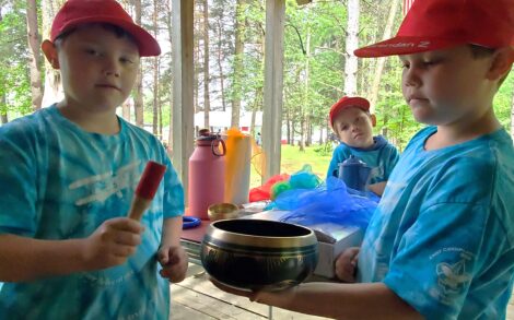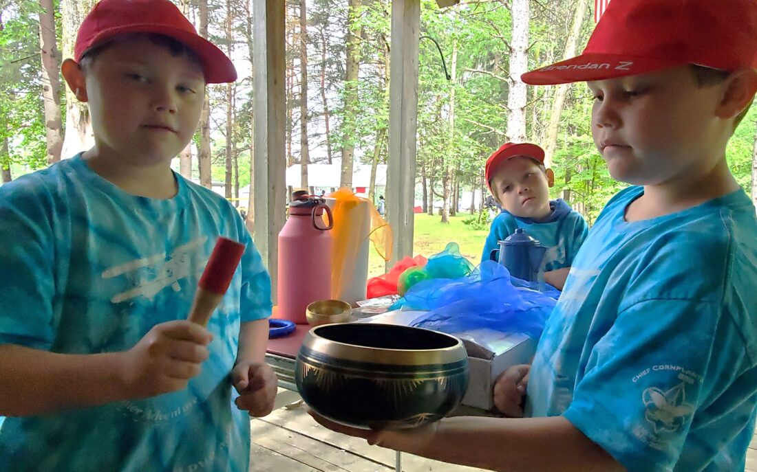 Cub Scouts Connor (left) and Brendan Zapel play a Tibetan singing bowl Friday at Cub Scout Camp on Fox Hill Road in Pine Grove Township.