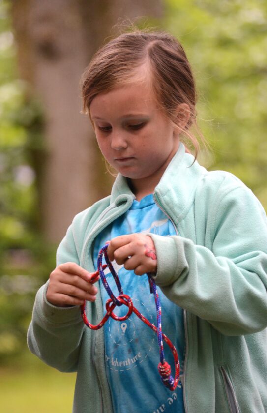 Times Observer photo by Brian Ferry Cub Scout Anna Nickerson works on a sheet bend knot Friday at Cub Scout Camp on Fox Hill Road in Pine Grove Township.