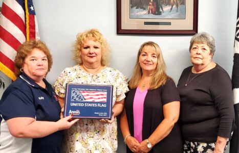 Times Observer photo by Brian Ferry Warren County 4th of July Organization Treasurer Kelly Thompson (left) accepts a donation of American flags from the staff of State Rep. Kathy Rapp (R-65), District Manager Luann Munksgard, Legislative Aide Jane Lucas, and Legislative Aide Judy Baker at Rapp’s office. Rapp and State Sen. Scott Hutchinson (R-21) donated 50 American flags to the organization to help line the 4th of July Parade route. parade flag donation 063023