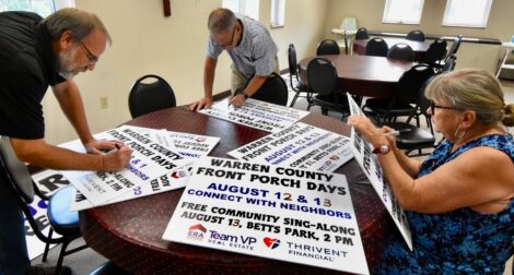 - Joe Whipp, Doug Hearn and Pat Evans updating lawn signs in advance of next month’s Front Porch Days.