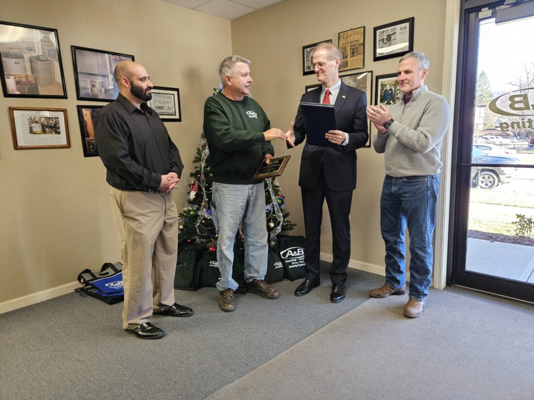 Photo by Jacob Perryman A&B Heating & Sheet Metal Co. owner Dave Papalia and state Sen. Scott Hutchinson, center, shake hands while Hutchinson presents commemorations from the state General Assembly honoring the business for 70 years of service. Warren County Chamber of Business & Industry Director of Chamber Operation John Papalia, left, and City of Warren Mayor David Wortman look on.