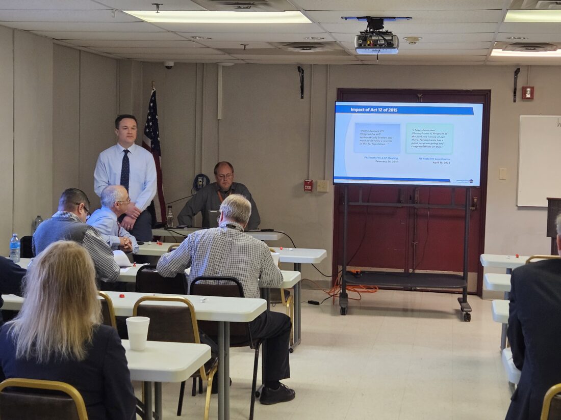 - Pennsylvania Emergency Management Agency Deputy Director Jeff Boyle speaks to those in attendance at a meeting on increasing the E-911 surcharge Friday afternoon at the Warren County 911 Center.