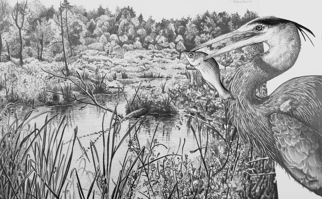 This drawing of herons in Spartansburg, Pa., is among the works by Jesse Wolfgang that will be included in an upcoming exhibition at the Crary Art Gallery.