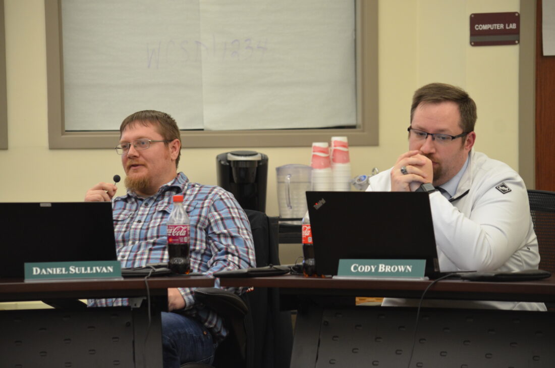 Times Observer photo by Josh Cotton Warren County School District board member Dan Sullivan, left, speaks on issues of liability during this week’s school board meeting. Administration presented information from the district’s insurance providers that would appear to prohibit bounce houses and dunk tanks at PTO events.