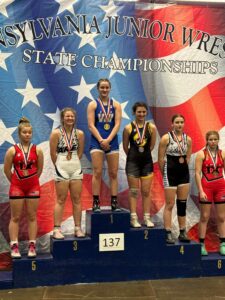 Kaelon Connolly, wearing her gold medal, stands proud at the top of the 2024 Junior High Wrestling Championship winners’ podium on Saturday, March 9 in Johnstown.