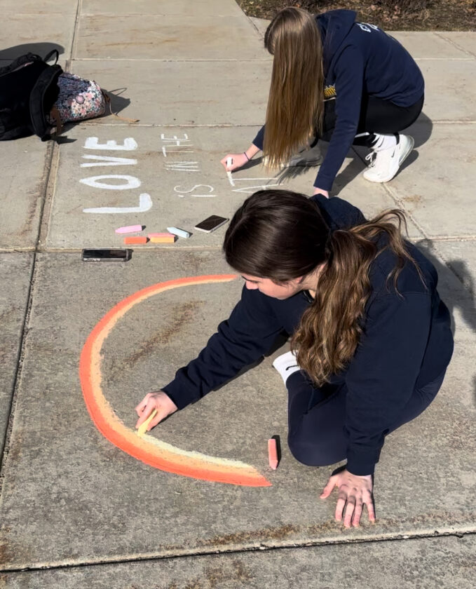 Student Council members spent their advisory period on Monday sidewalk-chalking outside the school with positive messages for students to see as they enter the building.