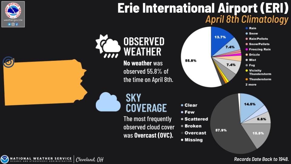 Data shows that no weather was observed on 55.8% of April 8ths since 1948 though 60 percent of those days were classified as “overcast.”