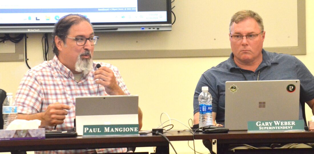 Times Observer photo by Josh Cotton Warren County School District Board President Paul Mangione, left, speaks during Monday night’s board meeting. The 2024-2025 budget was approved and includes a two mill property tax increase.