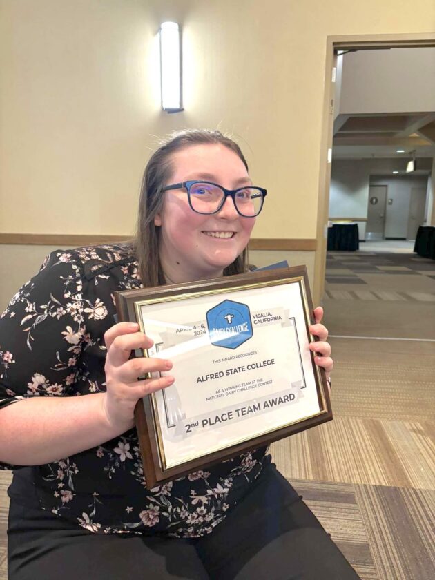 She also recently competed at the National Dairy Challenge held in Visalia, Calif as part of a team of four students from Alfred State College, Cornell University, the University of New Hampshire and the University of Wisconsin-Madison. The competition focused on the teams working with the management team of a dairy farm and presenting on how to increase profitability of the working farm.