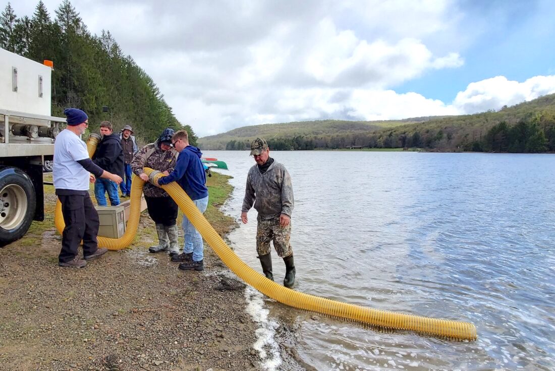 Times Observer file photo A group of volunteers assisted Corry Fish Hatchery Fish Culturist Toby Goble (left) in releasing about 1,700 rainbow and brown trout into the lake at Chapman State Park in May 2023. The FIsh and Game Commission has approved an action - effective Jan. 1 - to remove fishing regulations that had been in place since the lake was dewatered in 2017.