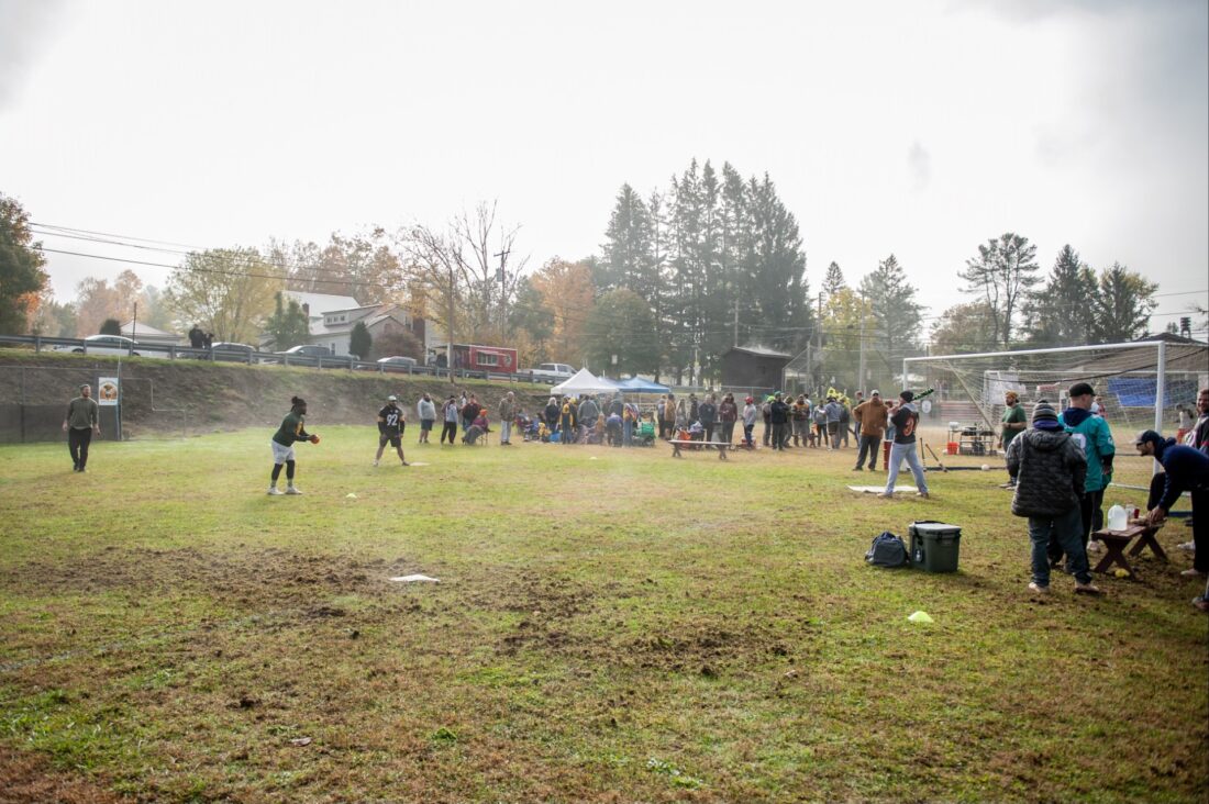 - The Clarkball tournament kicked off on Saturday as the fog lifted in Tidioute. Pictured are players and spectators on the playing field.