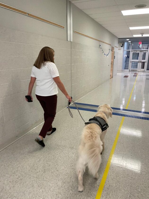 Jupiter and her handler Lacey Schuler on their way to a classroom.