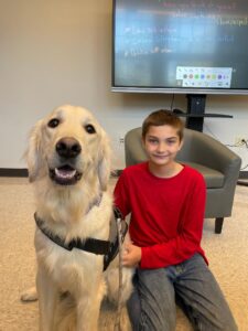 At 4 years old, golden retriever Gus is the oldest of the PAWSitive Program dogs but you wouldn’t know it! Gus has the youthful exuberance of a pup and loves to make the students and staff happy to be at school. You cannot resist his wide smile and wagging tail. Gus has been at Youngsville Elementary Middle School with his handler, school counselor Laura Bierbower for 2 years. During morning arrival Gus greets the rush of students and staff that, at times, have to stand in line to see him. “Seeing Gus is why I came to school today,” said 8th grade student Lilly, “I had some issues last night and seeing Gus makes it better. He makes us smile.” Throughout the day Gus attends classroom lessons geared at social and emotional learning with Bierbower as well as one on one meetings with students and/ or their parents making everyone feel more at ease. “So many moments over the past 2 years he finds the kids that need him,” said Bierbower of the connections Gus makes with the students, “It brings tears to my eyes.” Gus takes zoomie breaks, vest free, in the school gym where he can run free and relax between tasks. Mrs. Bierbower and Gus visited Mandy Marcu’s 4th grade classroom and every hand was raised when she asked What does Gus do for you? “When you have a lot of emotions he’s always there for you,” said one student. “If you’re upset he will help you calm down” said another. The students love reading to Gus and around the room agreed that Gus is a good listener and is cute and cuddly. “Every school should have a dog,” said Marcu.