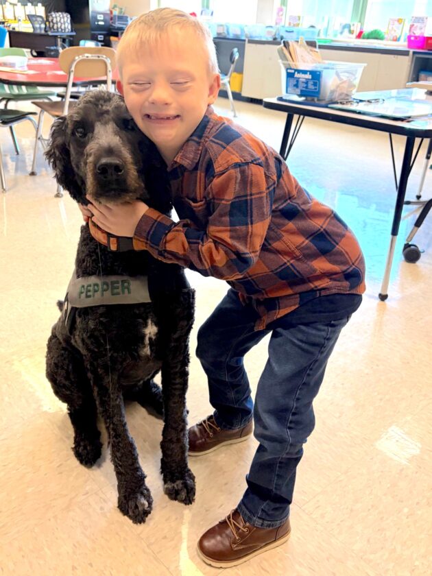 - Pepper and a student in their “hallway hats” to help with transitions to and from the classroom.
