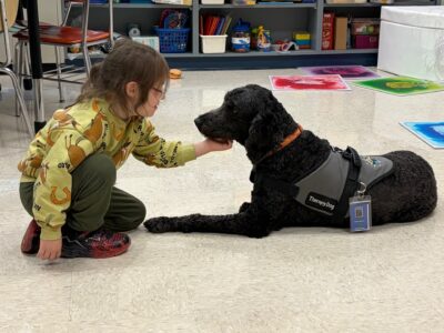 Pepper is one of the original PAWSitive dogs. At 3 years old she and her handler Occupational Therapist Cayla Onoratti work between the Warren Area Elementary Center and Sheffield’s school making their days very busy. “She loves her job” says Onoratti “She lives to work.” Pepper can be found attending 4th grade math where her presence offers support to the students and helps them focus on their studies. WAEC teacher Mrs. Curren praises Pepper saying “We love having her in the classroom. She makes everything better. They work hard so they can give her a treat!” Escorting students between classes is one of Peppers key roles for those that may experience a tough time in noisy, busy halls. With her calm demeanor and obvious adoration of the children Pepper spends a great deal of her time in the life skills classroom at the school. The adoration goes both ways. The students and staff in the classroom are thrilled when she enters the room. “Pepper!” they all call out when they see her. She responds to sign language and waits patiently for words formed by those using an iPad-like device known as an AAC for communication. Pepper has also been known to alert when a child is experiencing a blood sugar issue. “She makes me feel happy,” said one 4th grader as a small group gathered around to give Pepper pets and hugs. “She makes my job more fun” Onoratti said “We’d be lost without her.”