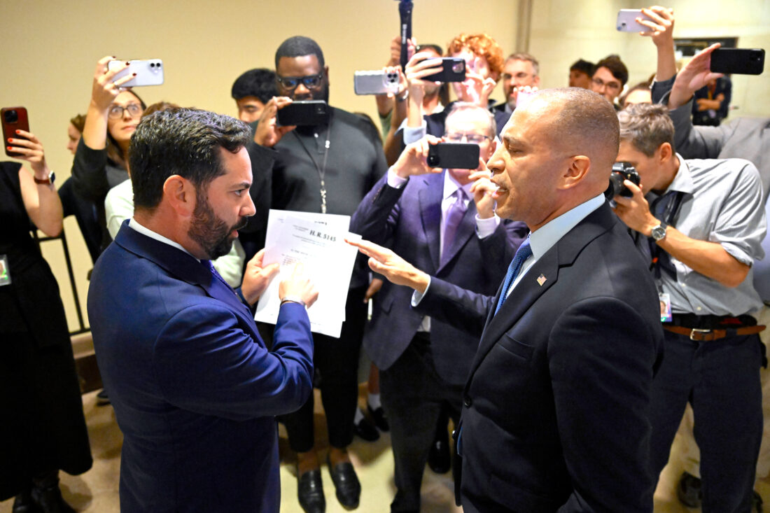 AP Photo Rep. Michael Lawler, R-N.Y., left, confronts House Minority Leader Hakeem Jeffries, D-N.Y., in a heated discussion to endorse House bill H.R.5145 that would extend the American Rescue Plan Act of 2021 (ARPA) and the Inflation Reduction Act of 2022 at the U.S. Capitol on Wednesday, Oct. 8, 2025, in Washington.