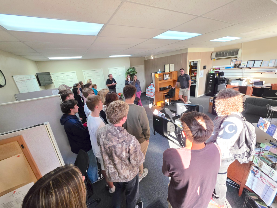 Cameron Bussoletti of JC Warren Real Estate discusses entrepreneurship with Warren County Career Center students during a recent downtown business tour.