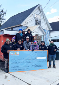 CRS workers present a check for a “free roof” to Thomas Rose.