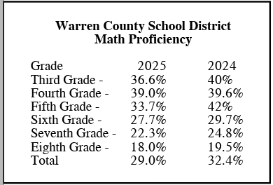 Math proficiency was down across the board for third through eighth graders in Warren County, decreasing from 40% in 2024 to 36.6% in 2025 for third graders; 39.6% to 39% for fourth graders, 42% to 33.7% for fifth graders, 29.7% to 27.7% for sixth graders, 24.8% to 22.3% for seventh grade students and 19.5% to 18% for eighth graders. Overall, proficiency for all Warren County students taking the third through eighth grade math tests decreased from 32.4% to 29%.