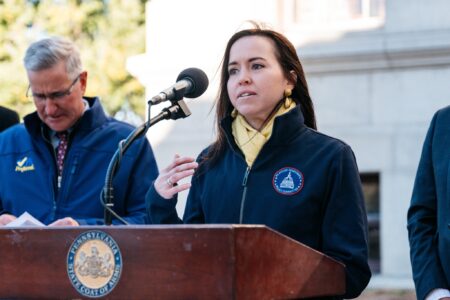 Rep. Emily Kinkead, D-Allegheny, is pictured during a November news conference.