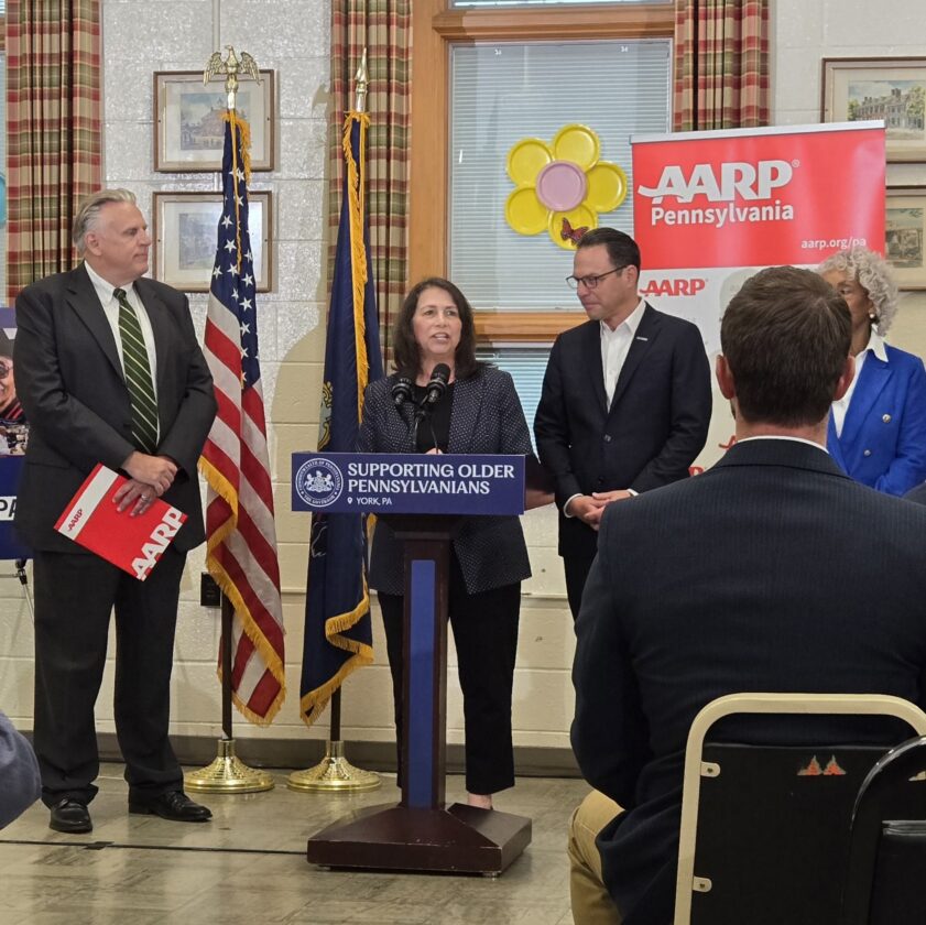 - A Homecare Association official speaks during a June news conference as Gov. Josh Shapiro looks on.