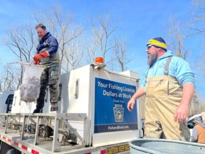 - Sen. Dan Laughlin, R-Erie, is pictured helping stock trout in Girard earlier this month.