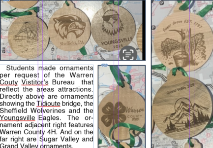 All of the proceeds go back to the respective school’s shop or pre-engineering classes. The Warren County Visitor’s Bureau has these for sale with a suggested donation of $5 (cash only.) So far, the following stores also have these ornaments for sale: the J. Lauren Interior Design in Tidioute, Moore’s Garden Shop in Tidioute, Tybout House in Warren, and Bean Bank Enterprises in Youngsville.