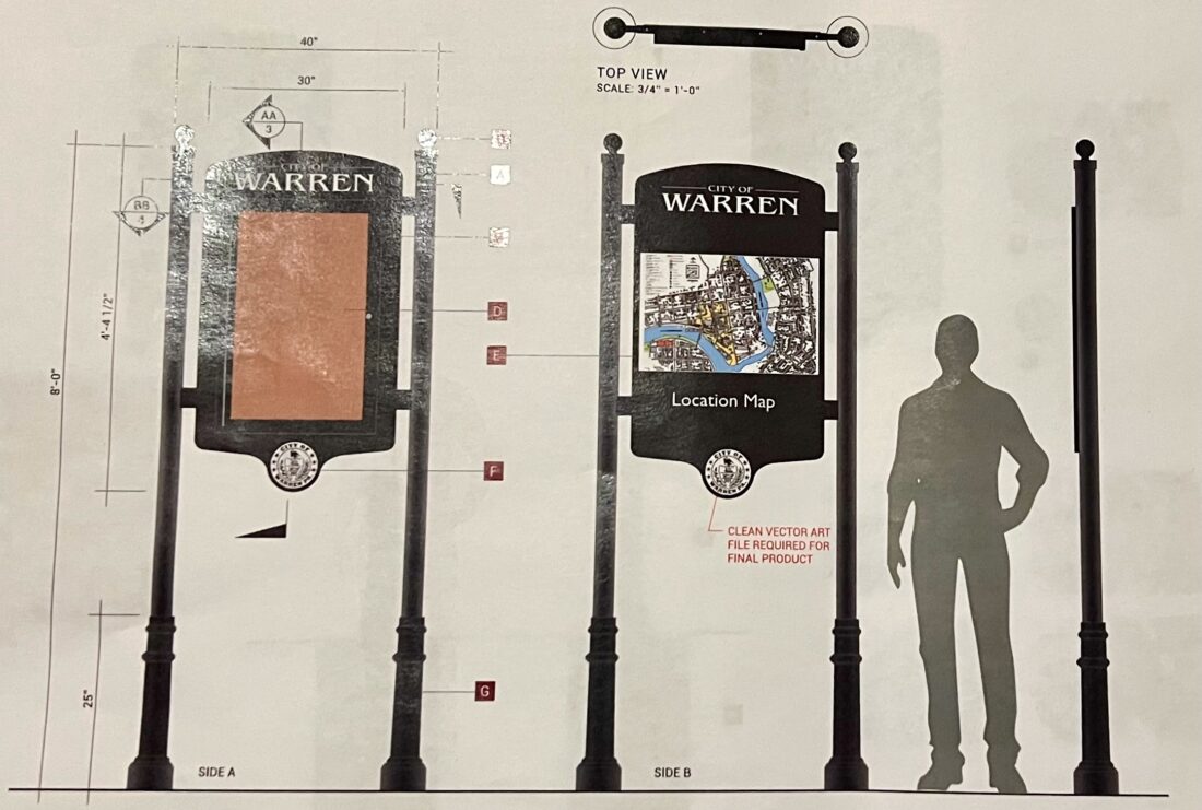 Kiosks will stand 8 feet tall and feature a city map, while wayfinding signs will measure 11 feet in height.
