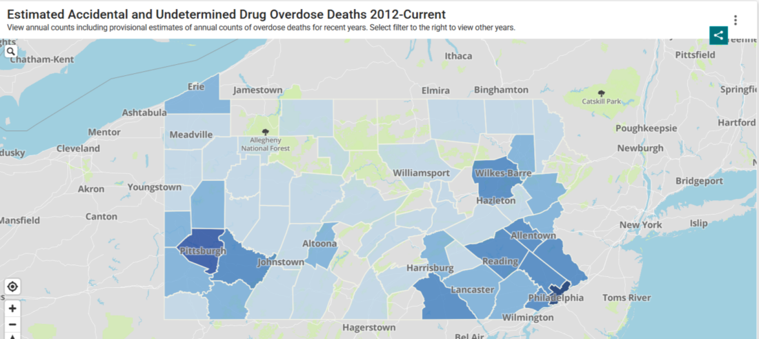 This map, provided by data.pa.gov, shows drug overdose deaths across the state.