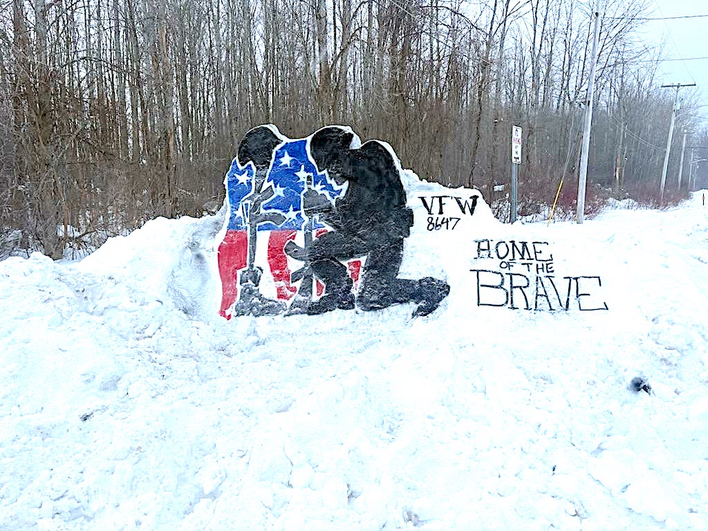 Liuzzo’s inaugural creation is showcased at VFW Post 577, 4498 Dutch Hollow Road. The artwork features a blackened silhouette of a soldier atop a snow mound, rendered in a hand salute position. It is accompanied by the inscription “Thank You Vets” and a waving, icy rendition of the American flag, adorned in red, white, and blue, with “VFW Post #577” etched in the ice.