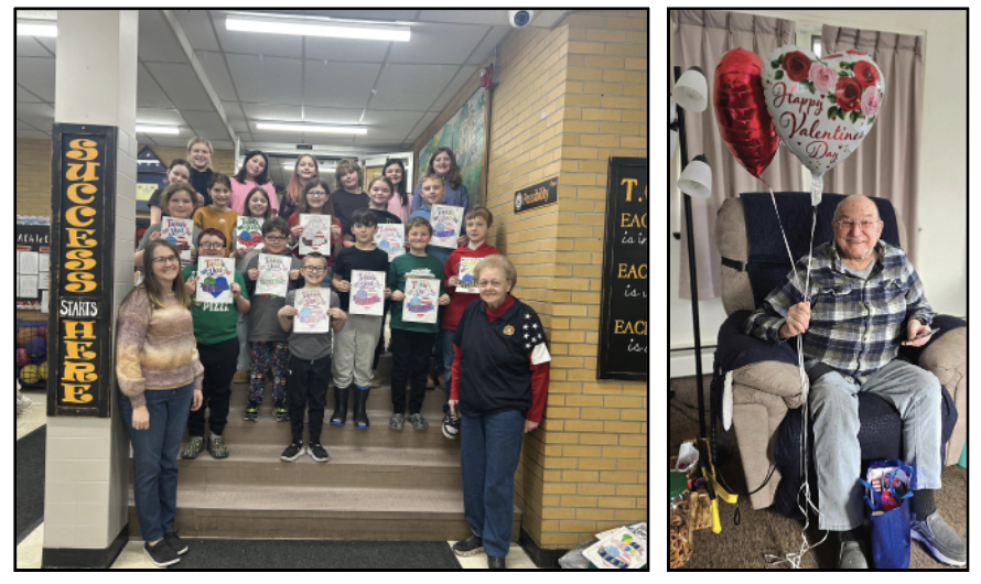 Photos submitted to the Times Observer At left Teacher Michelle Buccardo is pictured with her class from Tidioute Community Charter School presenting valentines to Doris Svitek, VFW Auxiliary. The school also collected donations for the Troop Box Program. At right Blue Star Mothers of Kinzua PA203 delivered a valentine to veteran Pete Beichner, a resident at the Crary Home.