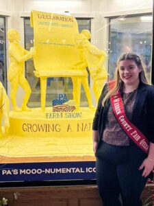 Warren County Fair Queen Alexis Stec is seen here with the iconic annual traditional 1,000 pound butter sculpture. This year’s theme highlighted the importance of Pennsylvania’s dairy industry, which ranks second in the nation for butter production. It featured the Founding Fathers of the United States.