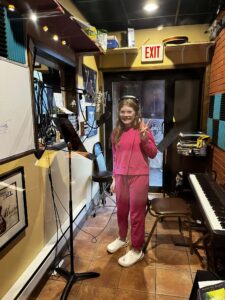 Pictured is Annabelle greeting readers with a peace sign in the recording studio at Warren Music Conservatory.