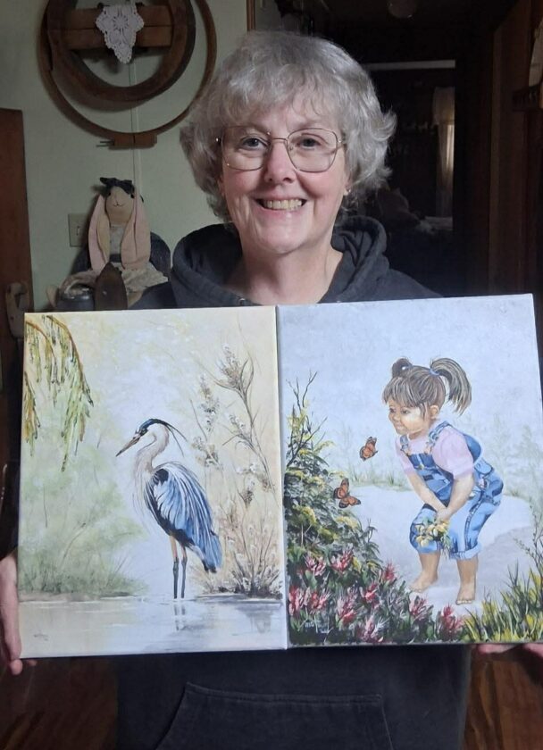 - Barb Matson is pictured here with her acrylic paintings. Matson donates her proceeds to local veterans.