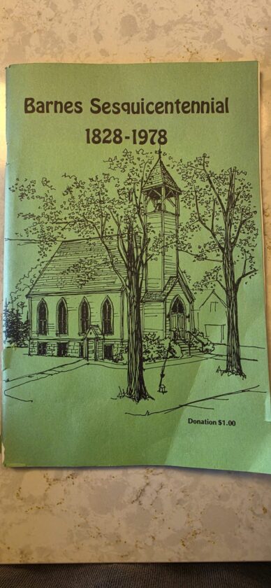 “150 years after Timothy Barnes settled in the area, slowly and steadily homes have continued to go up and as time moves on more people call Barnes home. The cemetery grows larger and the list of people who have lived in the older homes gets longer. We do not know that if in 50 years, the logs will still be exported from our forests or the oil still be pumped from our wells, but we feel quite confident that those people who will plan the 200th birthday of Barnes will be every bit as proud, and feel as fortunate to be associated with this community as its citizens have for the first 150 years. We wish to offer the 200th committee some advice. Take lots of pictures of your community. Interview older citizens.”