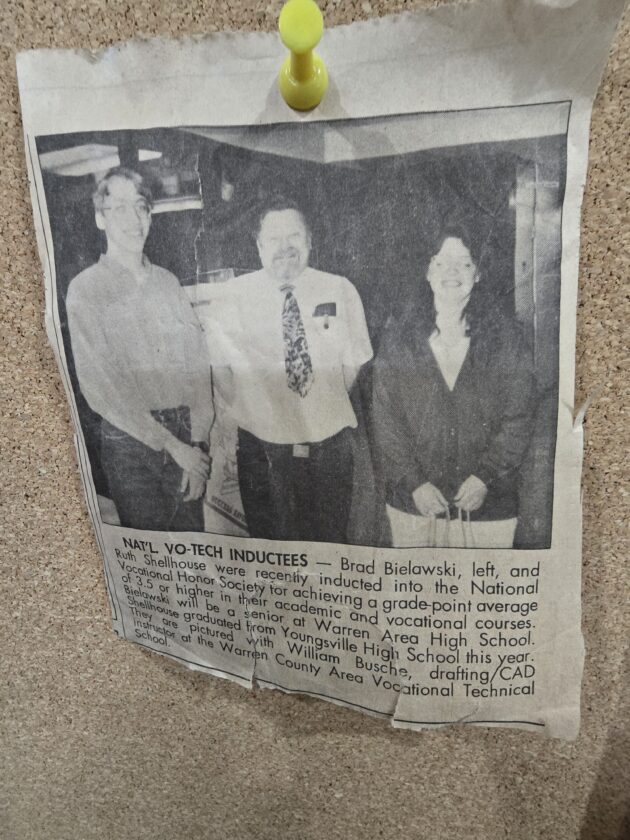 On the wall next to Bielawski’s desk, there is a photo that was cut out from the Times Observer all those years ago of Toscano and Bielawski as Career Center students with their Drafting teacher, Mr. Busche. Neither of them dreamed then that they would spend their careers together at Whirley.