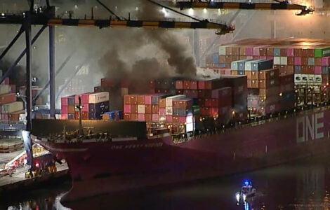 A fire on a container ship docked at the Port of Los Angeles was nearly contained Saturday afternoon, though authorities were still assessing whether enough hazardous material burned to cause significant contamination.