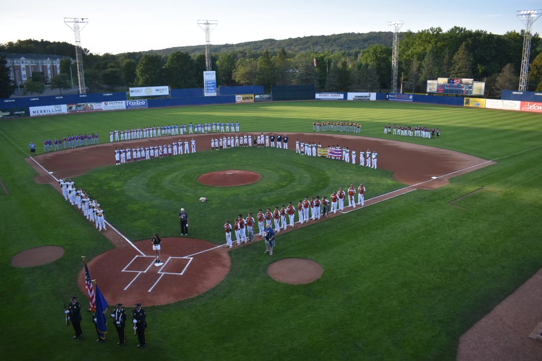 Teams from across the nation line the diamond for the opening ceremonies of the Babe Ruth 13-year-old World Series on Saturday night at Diethrick Park in Jamestown. P-J photo by Scott Kindberg