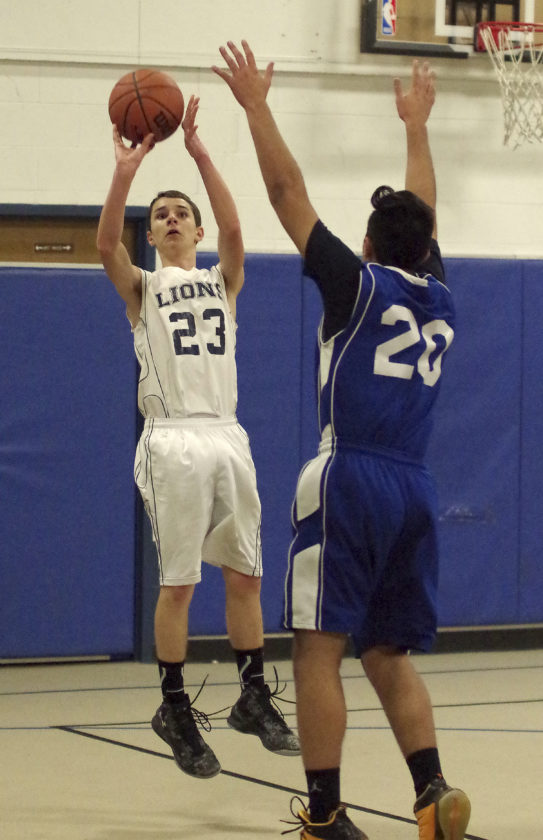 - Warren County Christian School’s Steven Brenner (23) knocks down a jumper over Erie Bethel’s Ricardo Rivera (20) Thursday at WCCS.