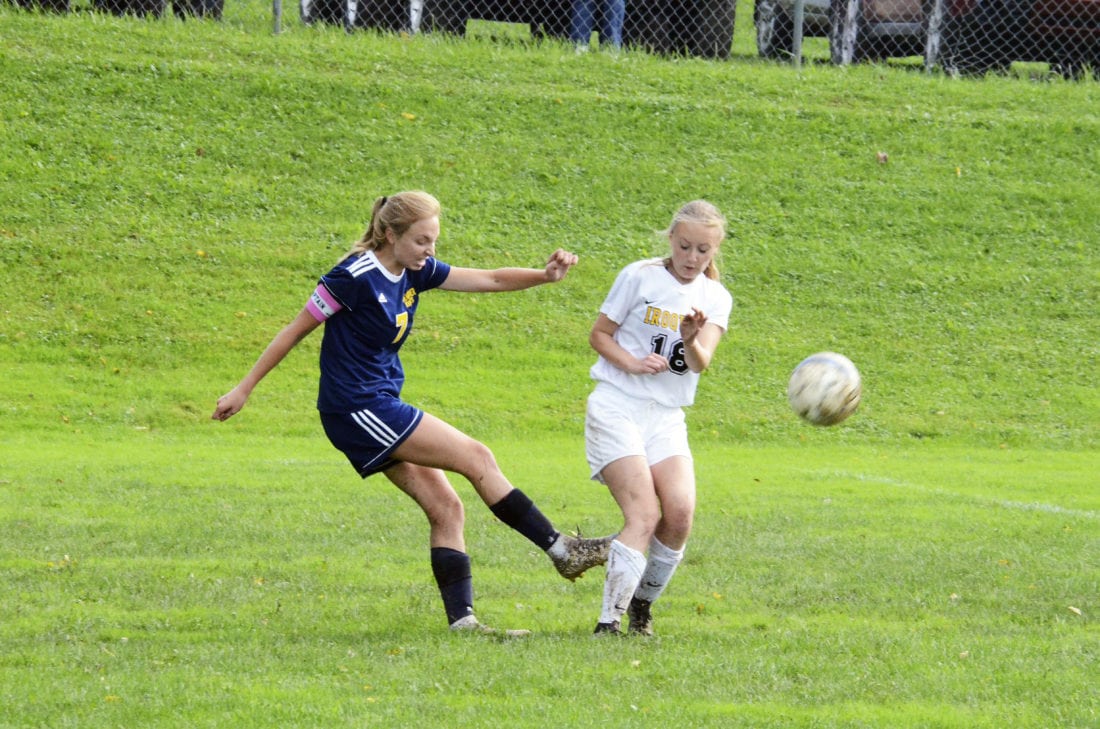 - Times Observer photo by Brian Hagberg Eisenhower’s Aleea Giese (7) fires the ball past Iroquois’ Jules Moore-Watson (18) during the first half of their match at Eisenhower High School, Wednesday, Sept. 26, 2018. The Braves earned a hard-fought, 2-0, win over the Knights.