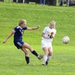 At 1:28, the Braves’ McKenzie Smith took a shot from well outside the left corner of the box. Lady Knights keeper Faith Johnson appeared to have the ball squared, but it skitted past her and into the right corner for a 1-0 Iroquois lead.
