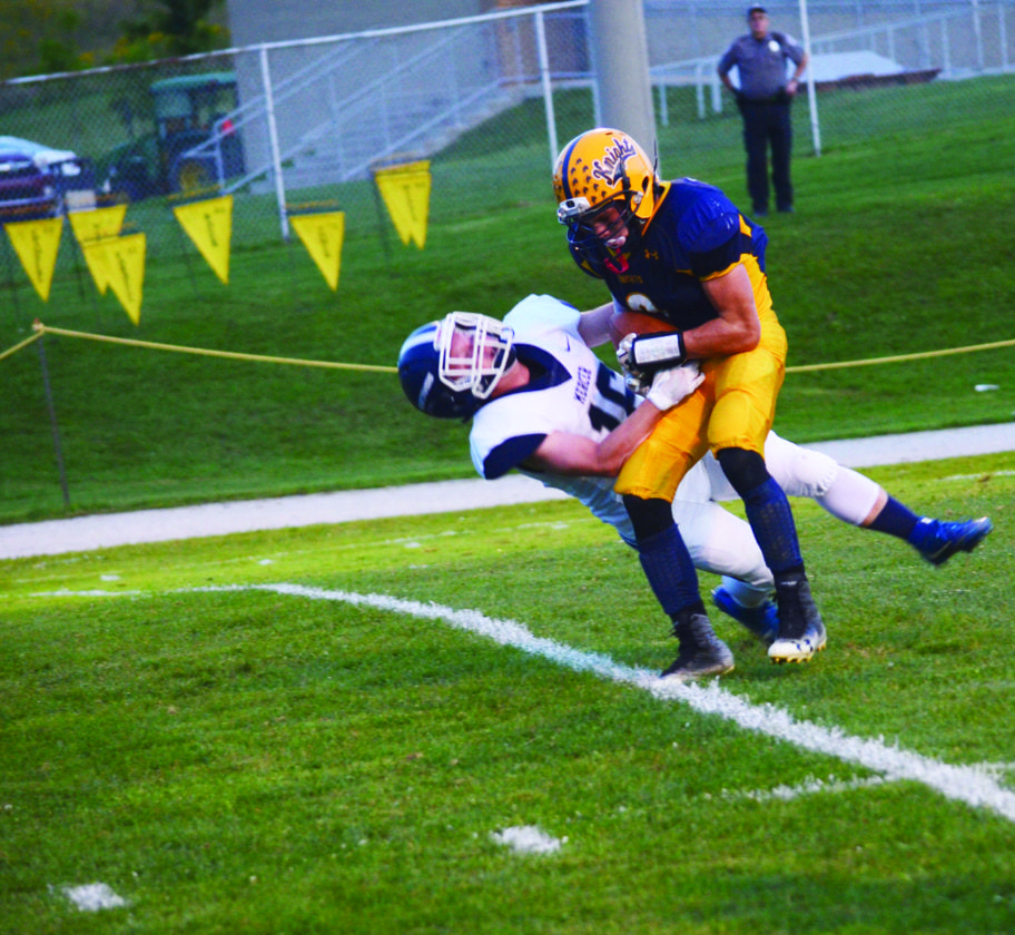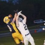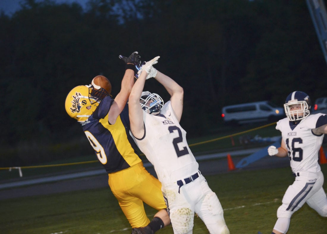 Eisenhower’s Zane Alexander (9) and Mercer’s Brian Shevitz (2) battle for a ball in the end zone thrown by Eisenhower quarterback Owen Trumbull. Neither player was able to pull it in, as the ball was batted in the air and intercepted by Danny Foore early in the fourth quarter of Friday’s game at the Pasture of Pain.