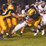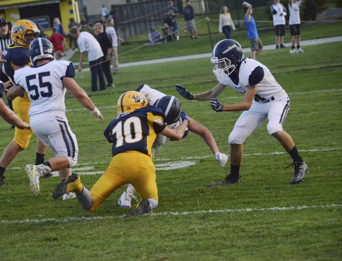 - Eisenhower’s William Schwanke wraps up Mercer’s Andrew Weinel during the first half of Friday’s game. Schwanke, as well as the entire Knights’ d-line, were stingy all night.