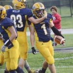 - Eisenhower’s Carter Knapp (1) is congratulated by teammate Tim Willis following Knapp’s 10-yard fumble return for a touchdown during the first quarter of Friday’s game against Mercer at the Pasture of Pain.