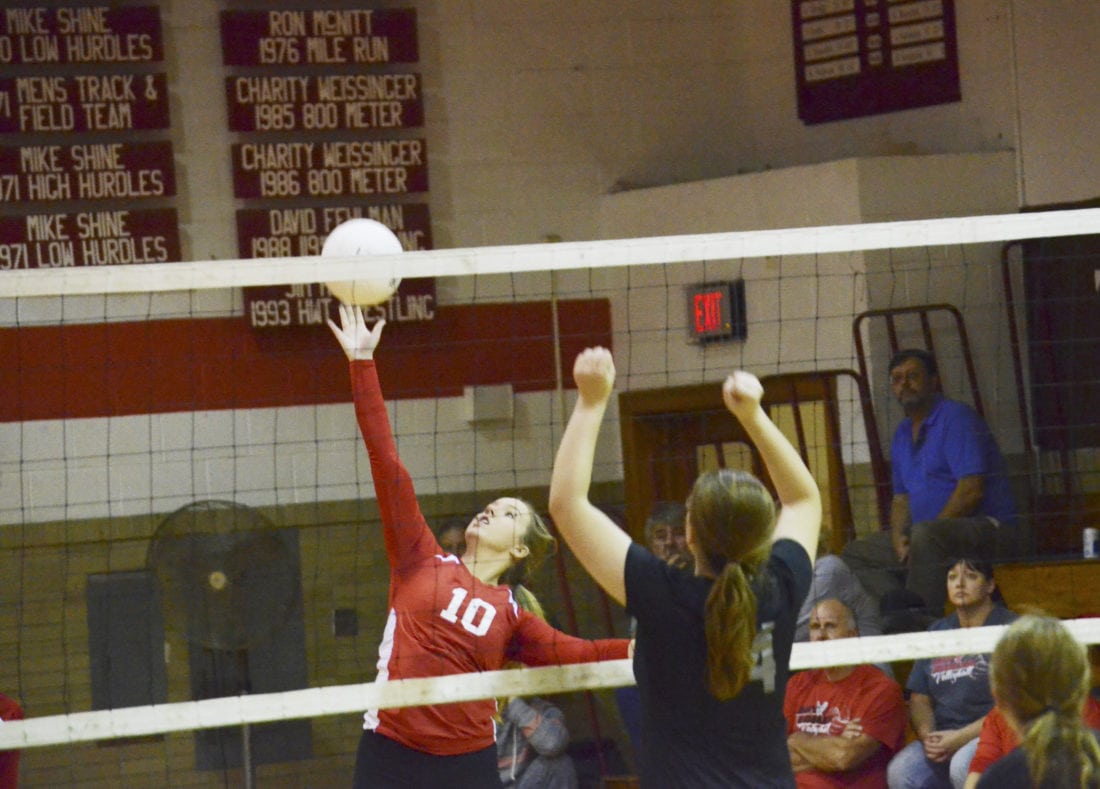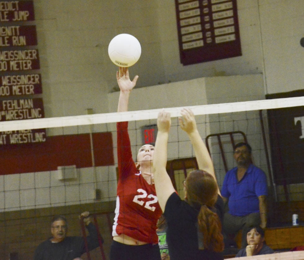 - Youngsville’s Maddie Uplinger taps a ball over the net during the first set of Thursday’s county clash against Tidioute on Thursday at Youngsville High School.