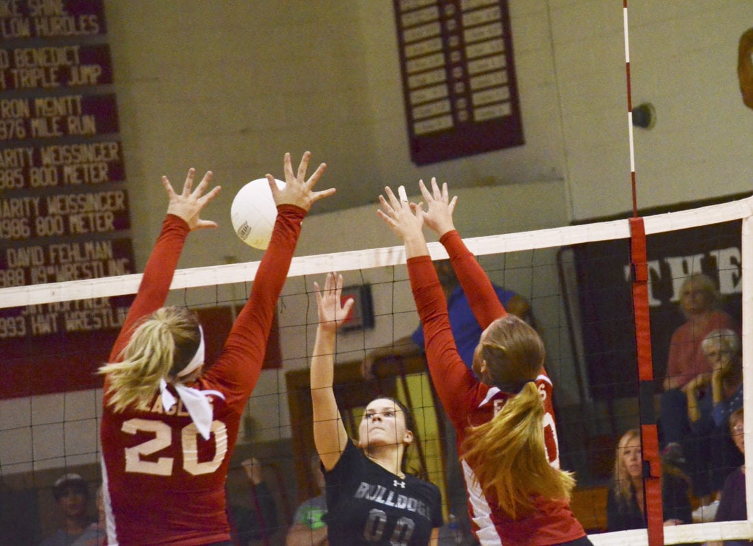 - Tidioute’s Shelby Proctor goes up over a pair of Eagle attackers.