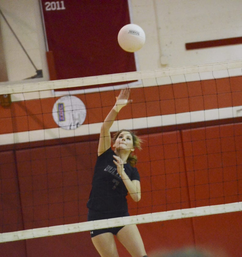 Youngsville’s Maddie Uplinger taps a ball over the net during the first set of Thursday’s county clash against Tidioute on Thursday at Youngsville High School.