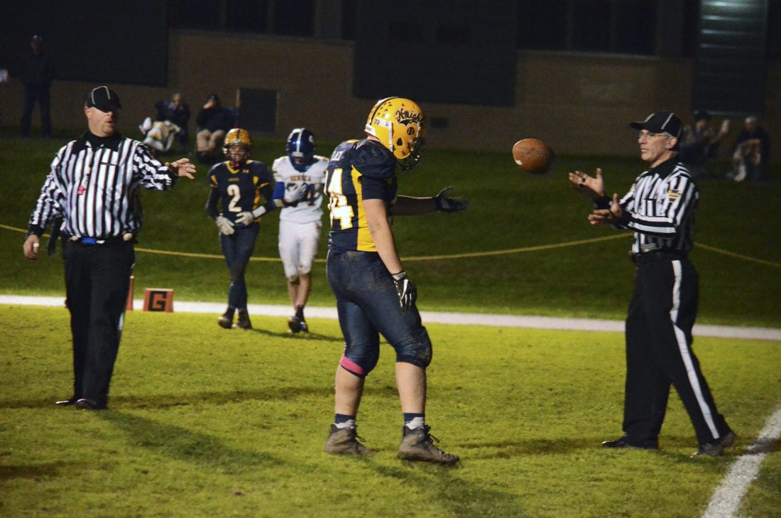 Times Observer photo by Brian Hagberg Eisenhower running back Cale Black (34) tosses the ball to an official following his 1-yard touchdown run during the first quarter of a game against Seneca at Riley Memorial Field, Friday, Oct. 26, 2018. Black rushed for a career-high 98 yards and this score to help lead the Knights to a 56-6 win over the Bobcats.