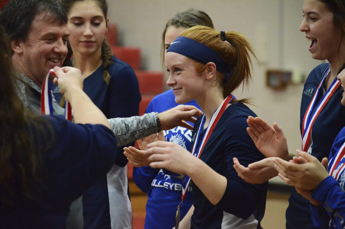 - Warren’s Lex Nyquist smiles as she receives her gold medal from coach Mike Dolan.